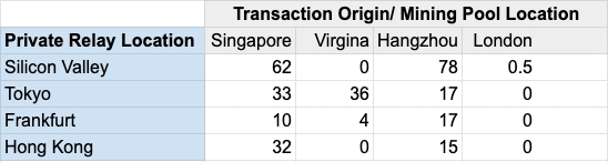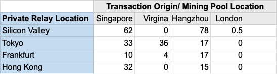 The better connected a user is to the BDN's Relay network, the less distance transactions need to travel, allowing users to hear of them faster. The same holds for mining pools receiving transactions. For example, sophisticated traders that have nodes located around the world would greatly benefit from bringing the BDN closer to their nodes. The table below lists the latency improvements (in ms) users can expect when accessing a Private Relay, assuming the user's Gateway is located in the same region as the Private Relay. The expected improvements are divided into 4 regions. The table displays the time a user saves when hearing about and sending a transaction to/from the region.