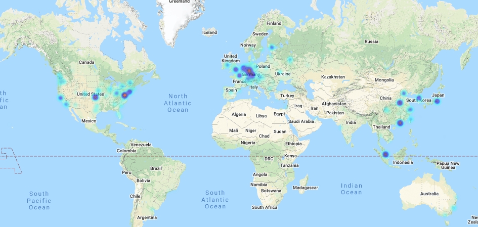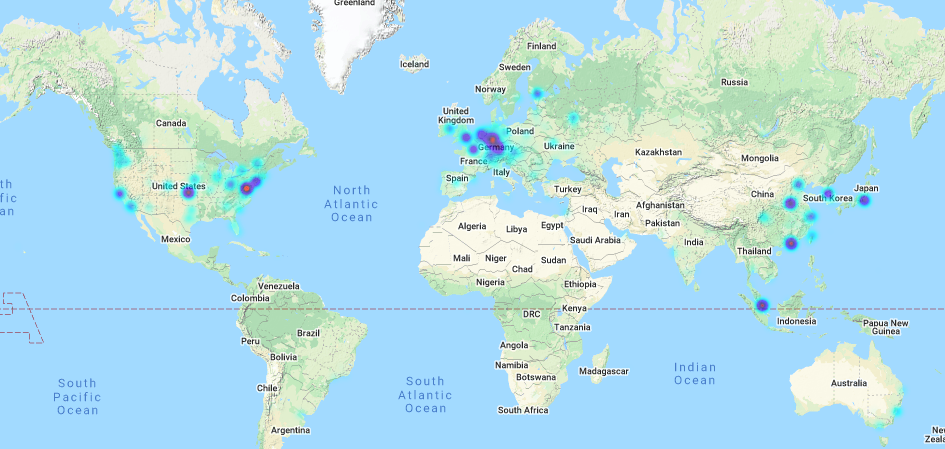 The map below shows the distribution of Ethereum mainnet nodes, as reported by ethernodes.org. Users can reference this to assess the value of Private Relays in various geographies.