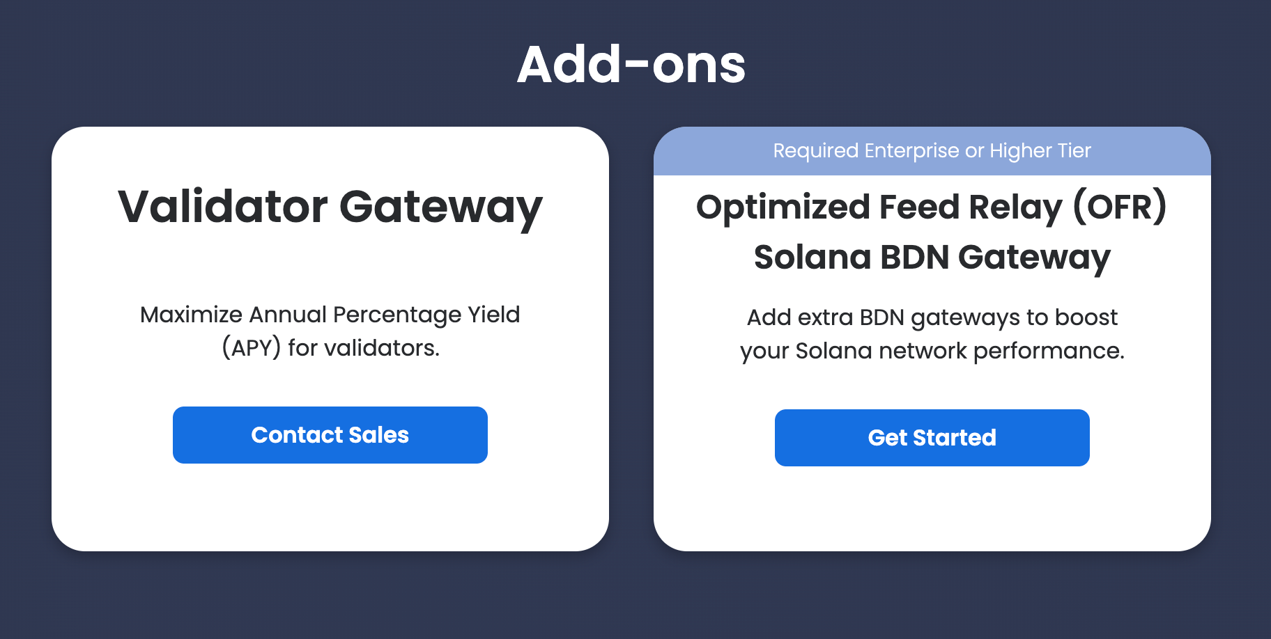 To get started with implementing the Validator Gateway, sign up for a bloXroute account and then scroll down to the "Add-ons" section of the plans page. Select "Contact Sales" within the Validator Gateway add-on.
