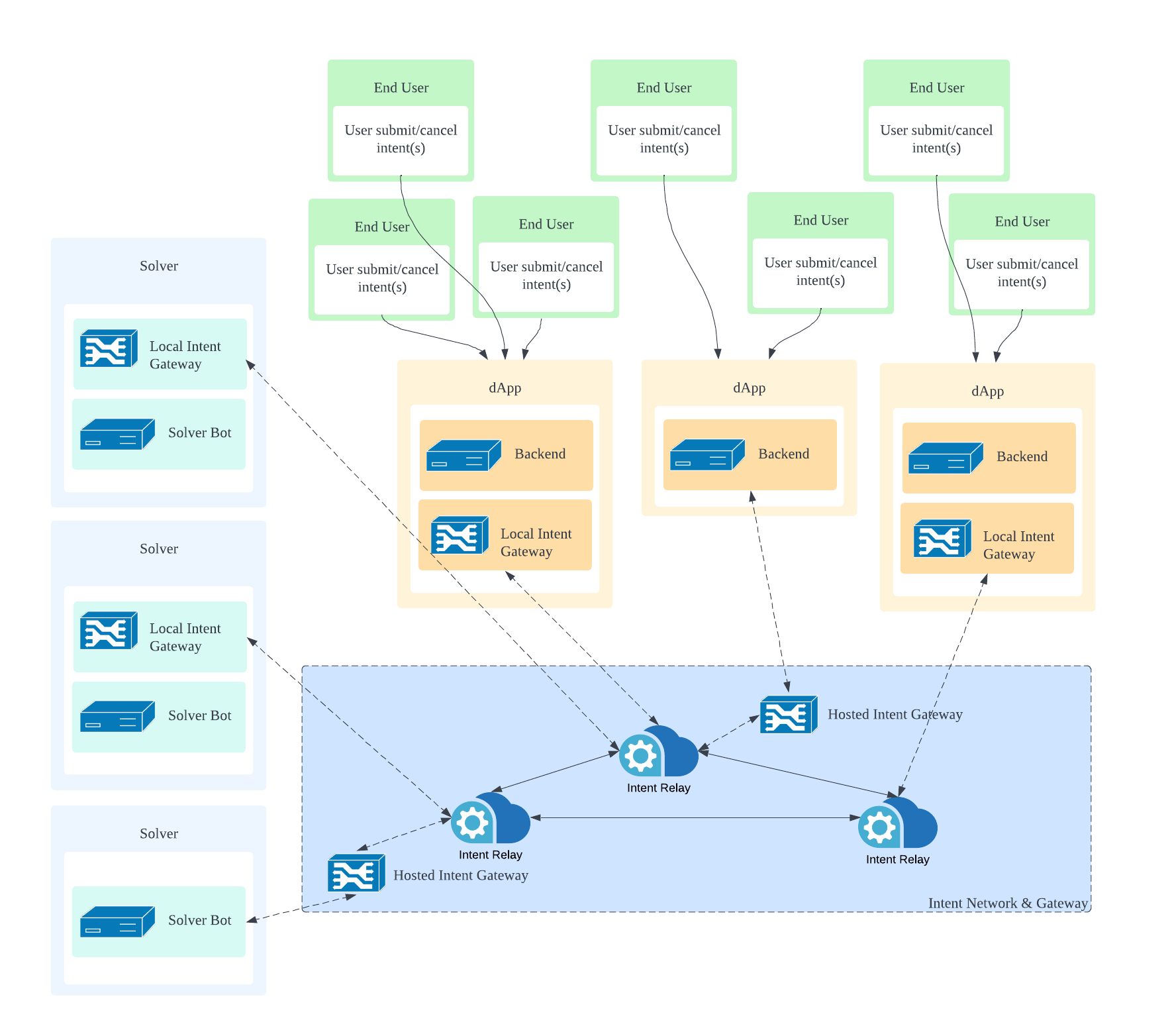 As shown below, dApp and solvers are connected to the bloXroute Intent Network through either a local gateway or a cloud services. Users will be able to subscribe to multiple streams and submit/manage intents/solutions through API endpoints.
