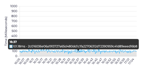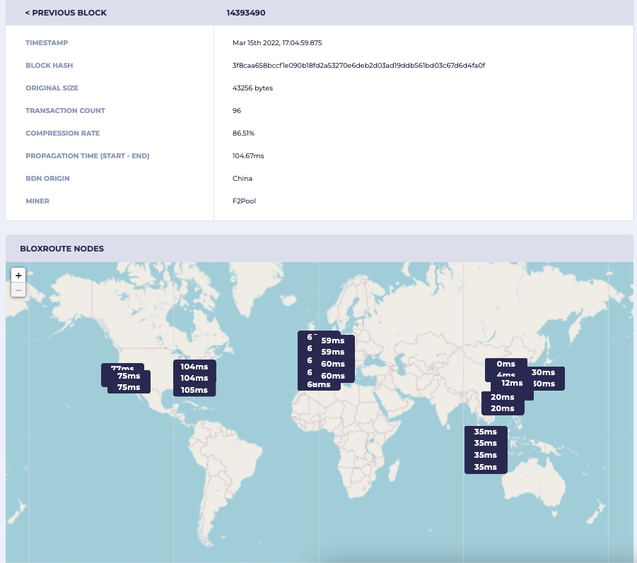 We also report the amount of time between when the first Relay in the network received a block or transaction and when the last Relay sent a block or transaction to the last Gateway. Hovering on the chart reveals the hash of the block that was sent, how long propagation took, and time (in your browser’s local time) at which the last Relay sent to the last Gateway the block or transaction.