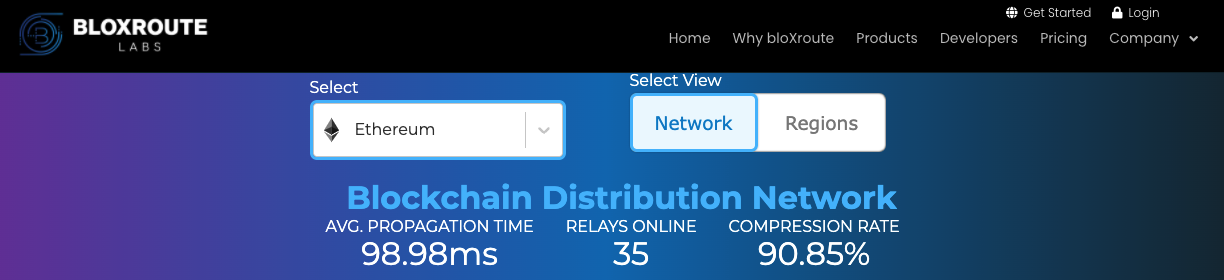 Below depicts an overview of the BDN including online Relays, Average Propagation and Compression Rate. There is also the ability to change Networks and view the site by "Regions".