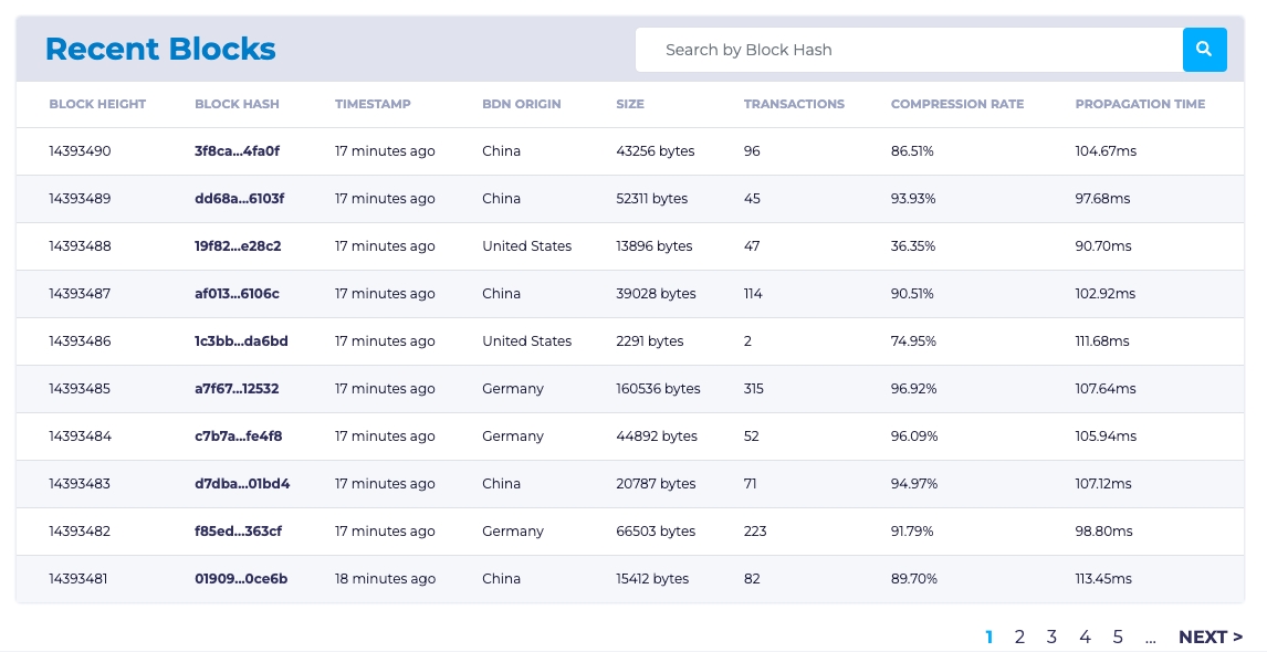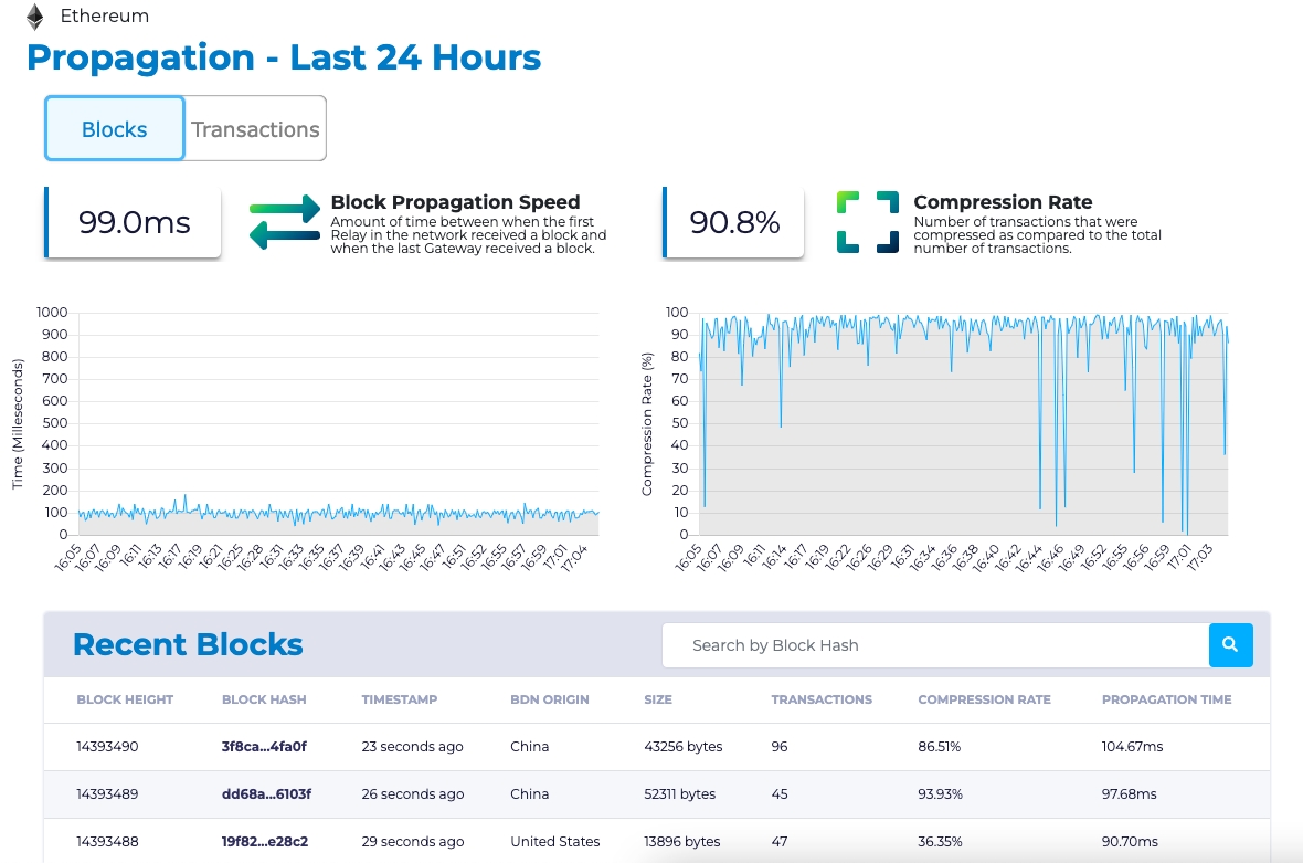 We also report the amount of time between when the first Relay in the network received a block or transaction and when the last Relay sent a block or transaction to the last Gateway. Hovering on the chart reveals the hash of the block that was sent, how long propagation took, and time (in your browser’s local time) at which the last Relay sent to the last Gateway the block or transaction.