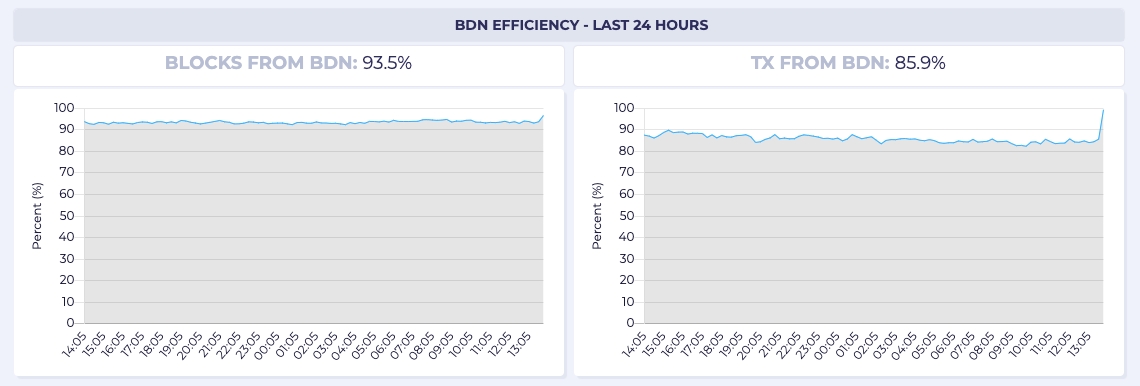 For example, in this 24-hour window, Gateways heard first from the BDN 90.4% of the time rather than the P2P network. Put another way, the BDN sent blocks faster than the P2P network to the Gateway 90.4% of the time.