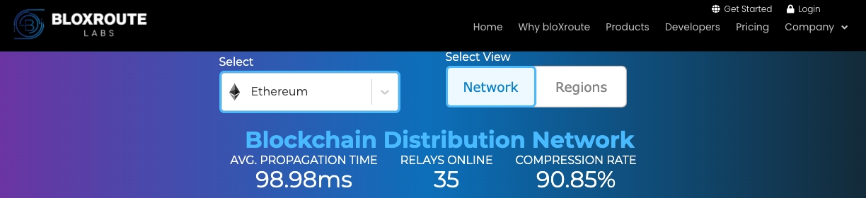 Below depicts an overview of the BDN including online Relays, Average Propagation and Compression Rate. There is also the ability to change Networks and view the site by "Regions".